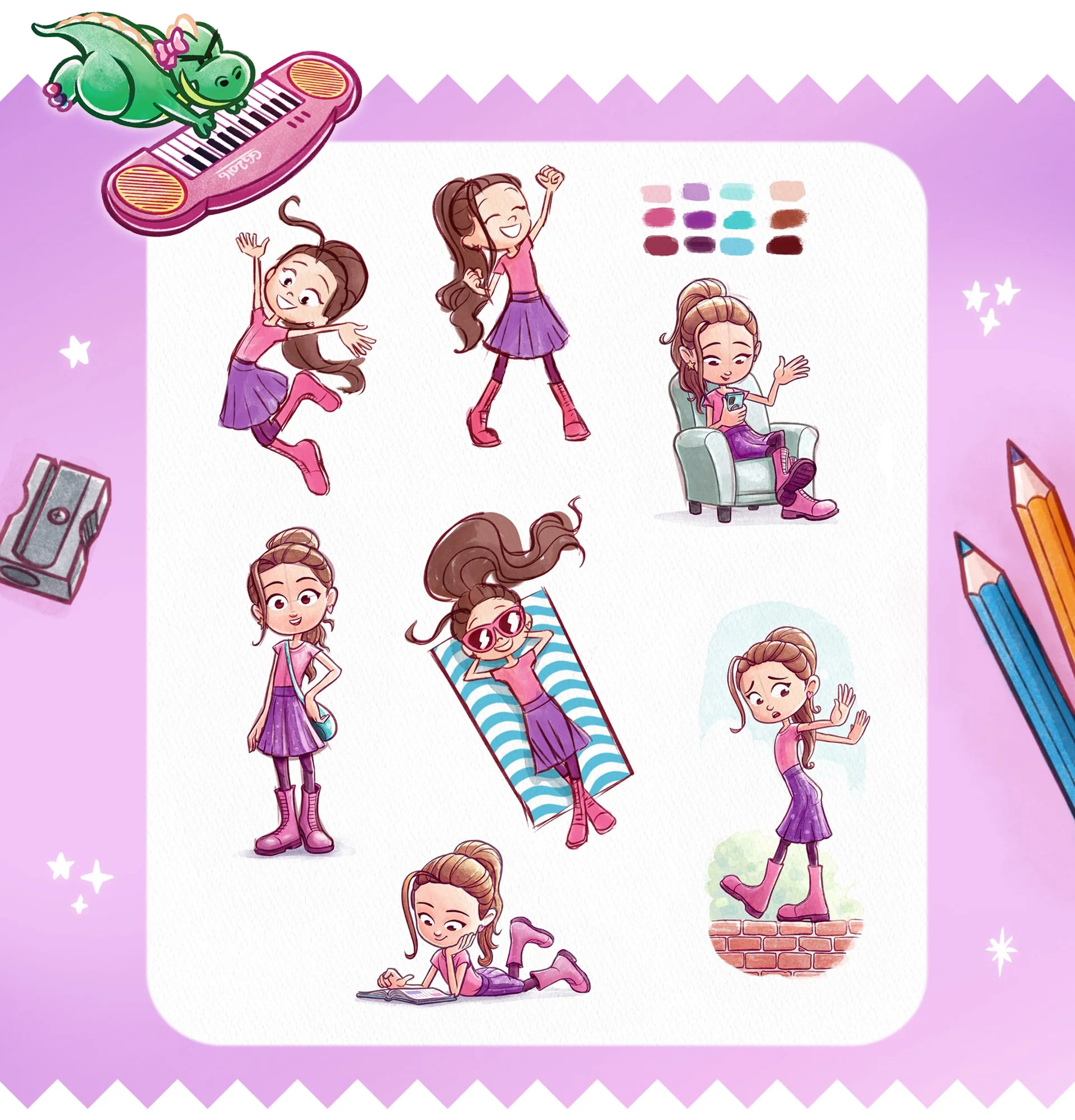 Pip was designed to feel curious, open, and relatable, and is loosely based on a real girl named Pip. I focused on a clear silhouette and expressive body language, making sure her emotions are easy to read even without text. Posture, gestures, and facial expressions play an important role in how she interacts with the world around her.